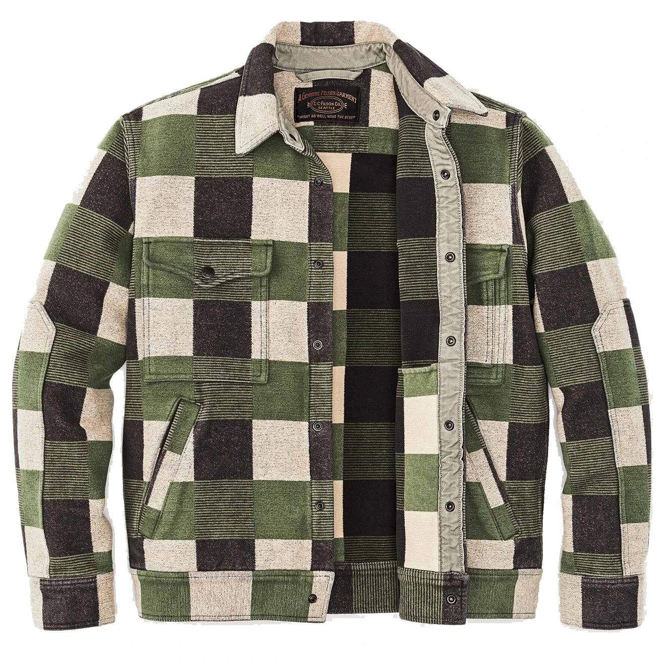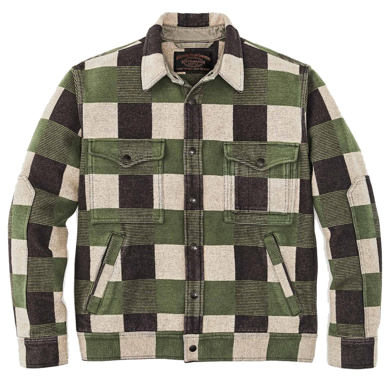 Filsons Beartooth Camp Jacket is made with thick blanket-weight cotton to fend off chilly fall days in the field. The snap-front closure is easy to work while wearing gloves, and its flap-closure chest pockets keep essentials close at hand. Angled-entry handwarmer pockets for added cold weather utility. Garment washed for a well-worn feel on day one.