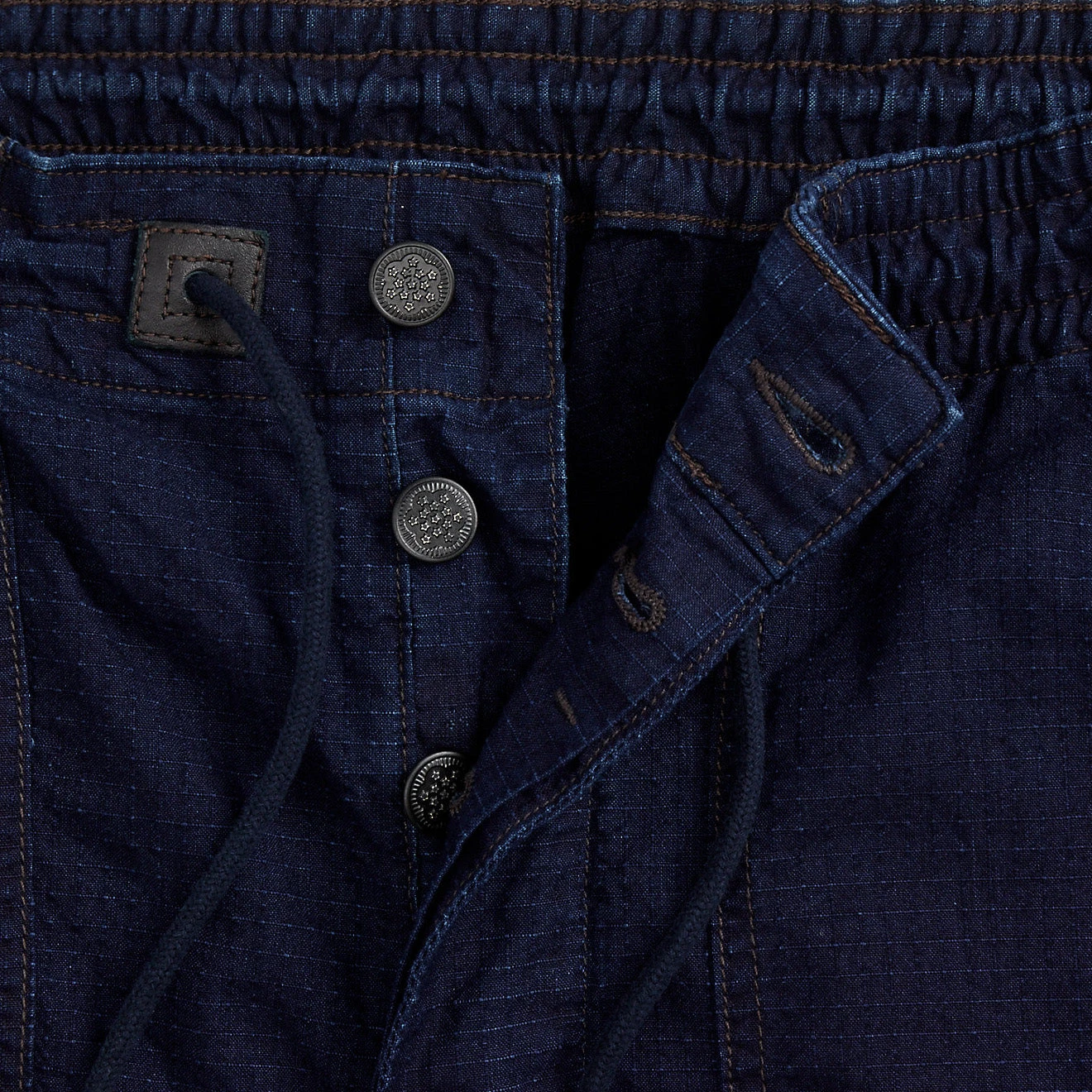 - Drawstring waistband with leather reinforcements. Button fly with a buttoned closure. Distressed metal buttons.