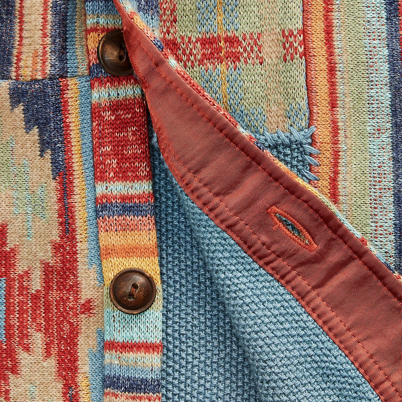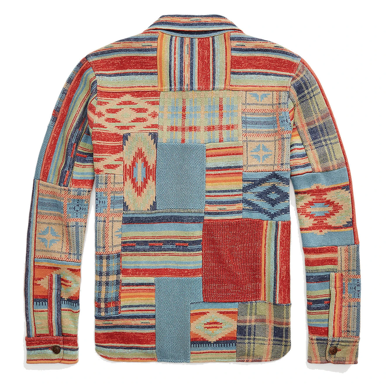 Workshirt jumper knit using a birdseye-jacquard technique. Composed of a linen, cotton and wool blend. Constructed from approximately 50 patches featuring 12 different patterns. Inspired by vintage blankets from the โ30s and โ40s. Corozo buttons. Washed for a vintage look.