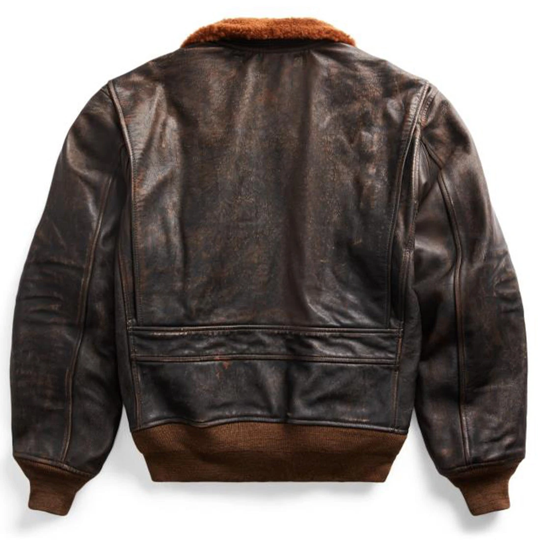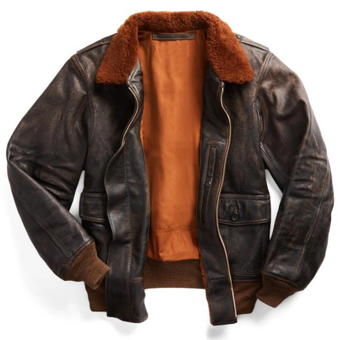 The RRL Shearling Leather Jacket has been constructed from cowhide with a black-over-brown hue. This jacket has been inspired by flight jackets, featuring a shearling collar and specially finished for a timeworn look and broken-in feel.