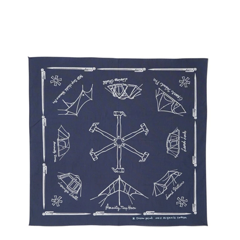 The Cotton Noasobi Bandana features Snow Peak’s tents and camping gear pattern. Its made from 100% cotton, woven and dyed in Japan.