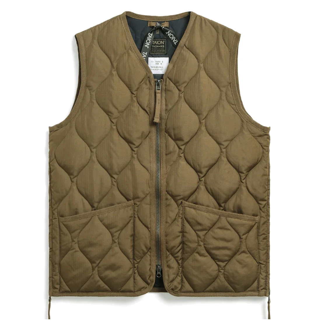 Elevate your outfit with Taion Military Zip V Neck Vest. Crafted from a down filled quilted polyester ripstop, with a webbing trim throughout. A timeless addition to your wardrobe, with endless styling options to explore.